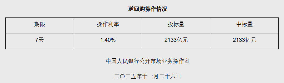 11月26日央行开展2133亿元7天期逆回购操作